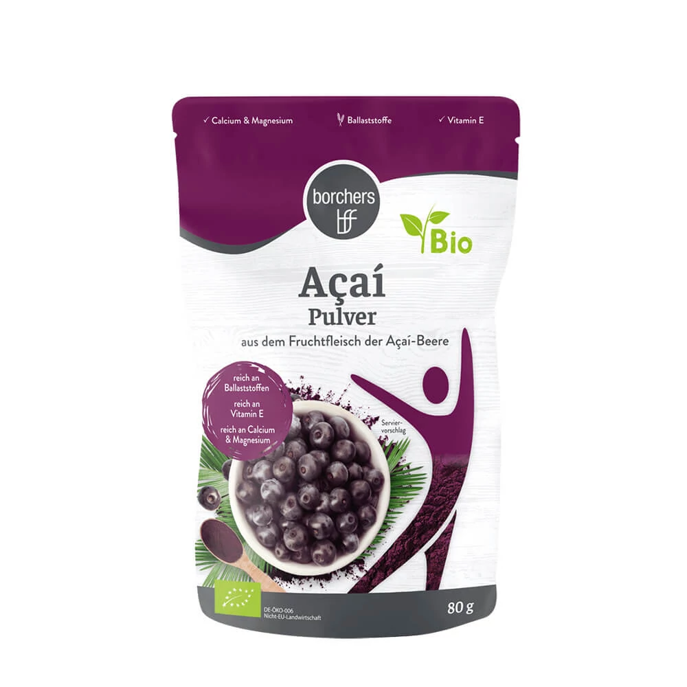 A Borchers Bio acai por készítésénél a gondosan kiválogatott acai bogyók pépét közvetlenül a betakarítás után dolgozzák fel, majd fagyasztva szárítják. A feldolgozás során így marad meg a legtöbb természetes E-vitamin, magnézium és kalcium, valamint a finom gyümölcsaroma, enyhén csokoládés jegyekkel. Az acai pálma apró gyümölcsei Brazília trópusi napsütése alatt érnek, és erőteljes, sötétlila színükkel és jellegzetes ízükkel friss lendületet visznek étrendedbe. Az acai por finom összetevője lehet például turmixoknak, smoothieknak és gyümölcsleveknek. Az acai por müzlihez, túróhoz vagy joghurthoz is adható.
