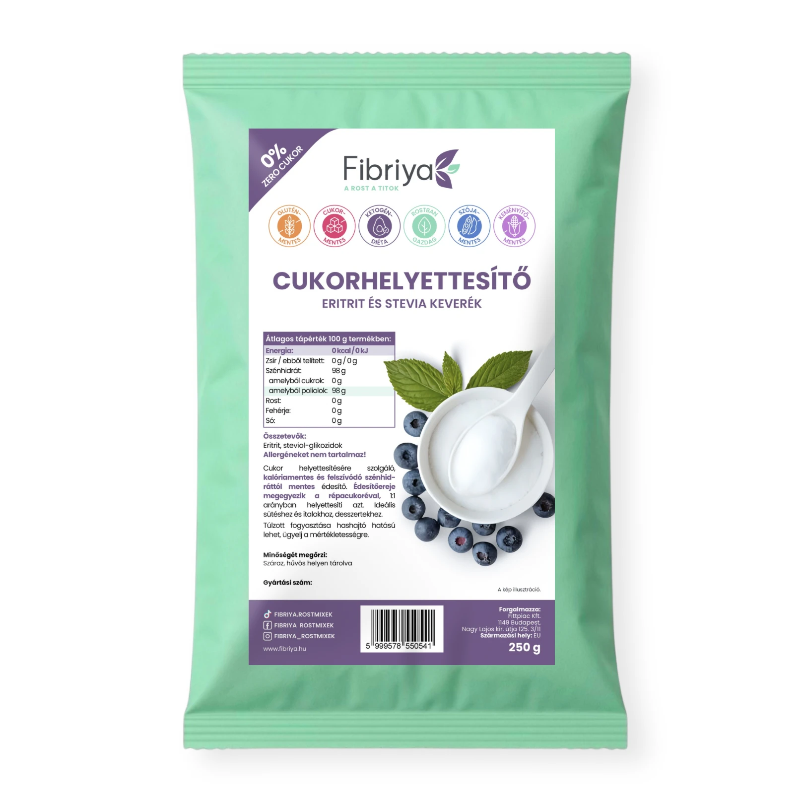 A Fibriya Cukorhelyettesítő eritrit–stevia keverék egy kalóriamentes, felszívódó szénhidrátot sem tartalmazó édesítő.