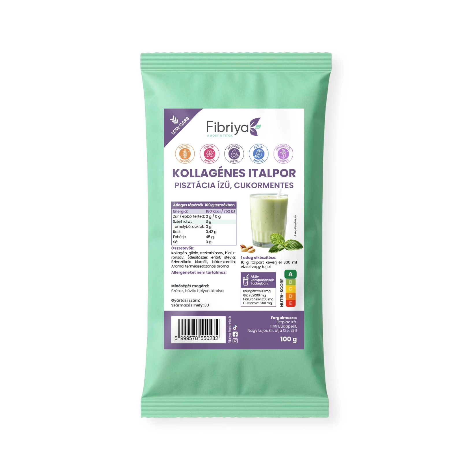 Összetevők (Pisztácia ízű): Kollagén, glicin, aszkorbinsav, hialuronsav; Édesítőszer: eritrit, stevia; Színezékek: klorofill, béta-karotin; Aroma: természetazonos aroma