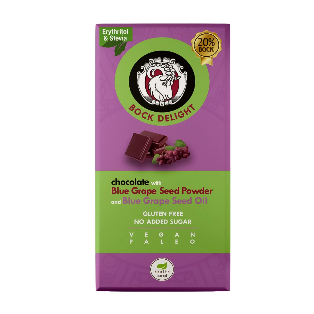 Összetevők: kakaóvaj (32%), kókusztejpor (20%), kékszőlőmag őrlemény (19,5%), édesítőszerek: (eritrit (14%), szteviol-glikozidok), élelmi rostok: (polidextróz, inulin), tápióka keményítő, kékszőlőmag olaj (1,6%), emulgeálószer: napraforgó lecitin, aroma Túlzott fogyasztása hashajtó hatású lehet. Földimogyoró, dió és tejet felhasználó üzemben készült.